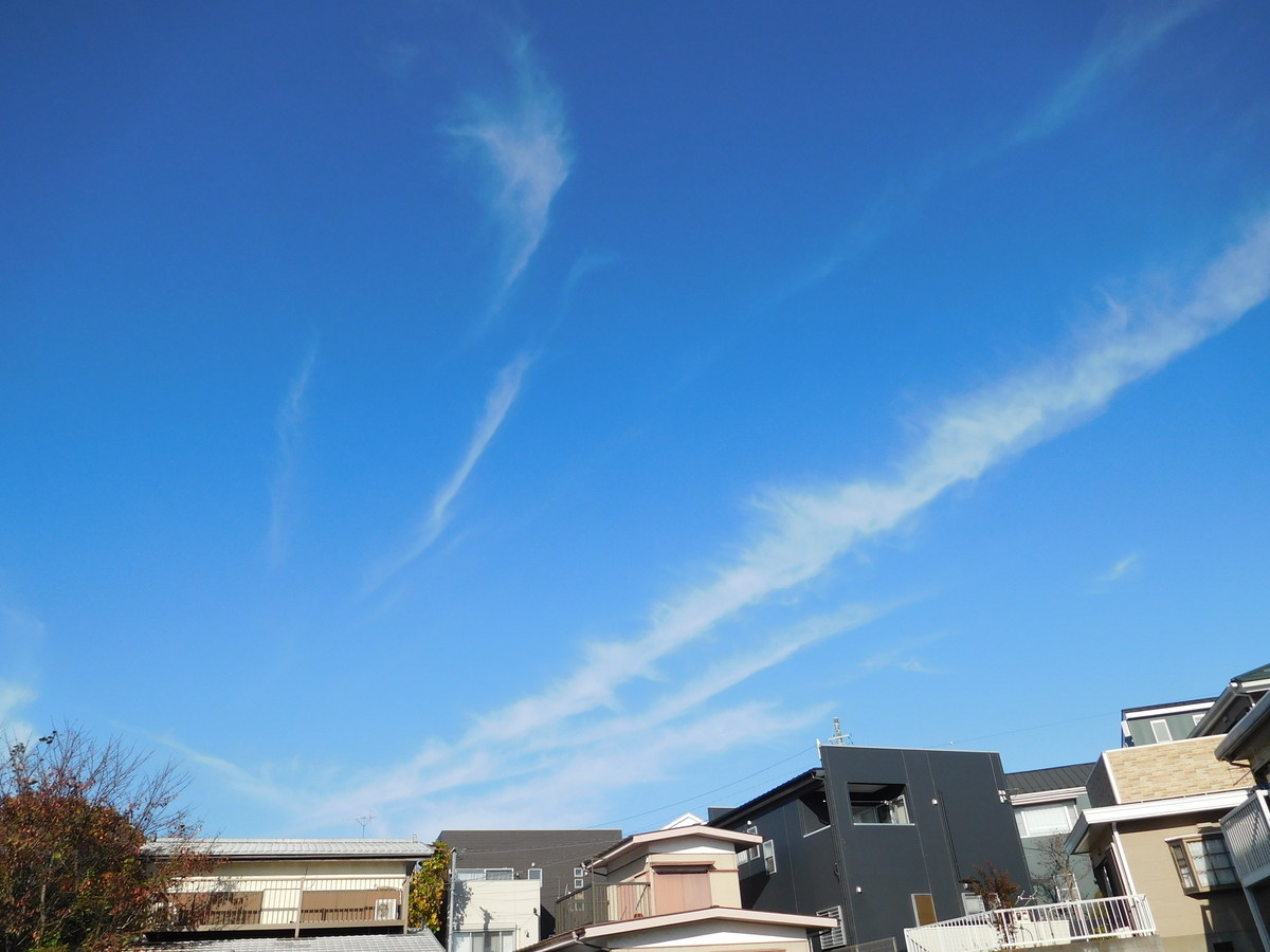 外はいい天気だ。アルコールもバナナも切れたので、北のスーパーへ買い物に行く。ついでにニェネントくん用のトイレのネコ砂も買おうと思い、またカートを引きずって出かけた。家を出たところで北の空にきれいなすじ雲がみれたので、写真を撮った。